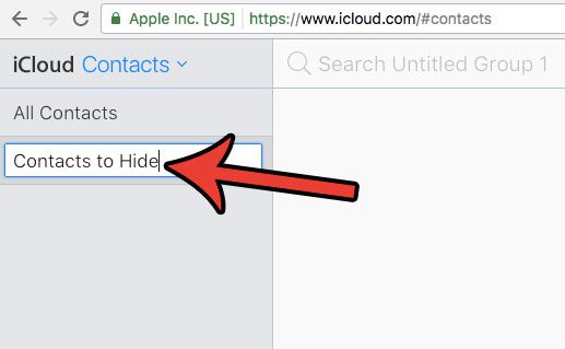Bemærk, at brug af kontaktgrupper vil kræve, at du placerer alle dine kontakter i grupper, da du ikke vil være i stand til at bruge nogen af opsamlingsgrupperne (Alle iCloud-kontakter, Alle Gmail-kontakter osv.) uden også at vise de kontakter, du ønsker at skjule. Så vores trin nedenfor viser dig, hvordan du opretter en iCloud-kontaktgruppe, men du bliver nødt til at sætte alle dine kontakter i grupper for at dette er effektivt.