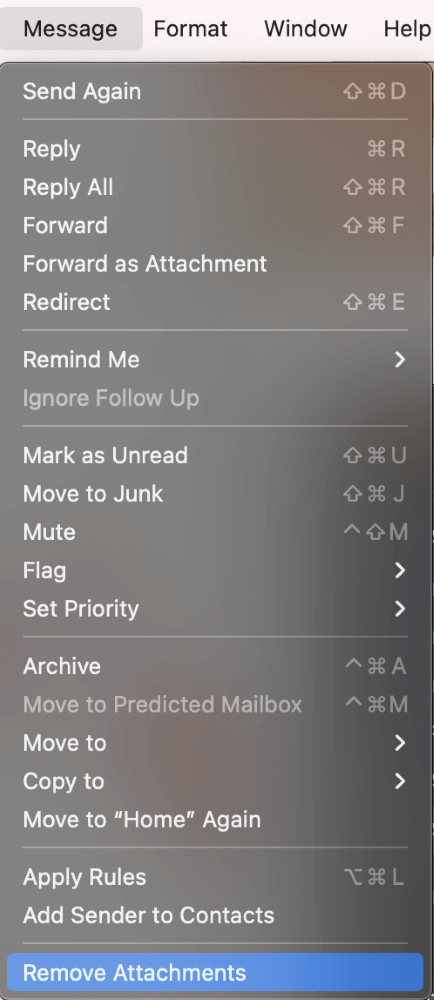 Klik på en meddelelse, der indeholder de vedhæftede filer, som du gerne vil fjerne. Klik derefter i menulinjenBeskedog ramteFjern vedhæftede filer.