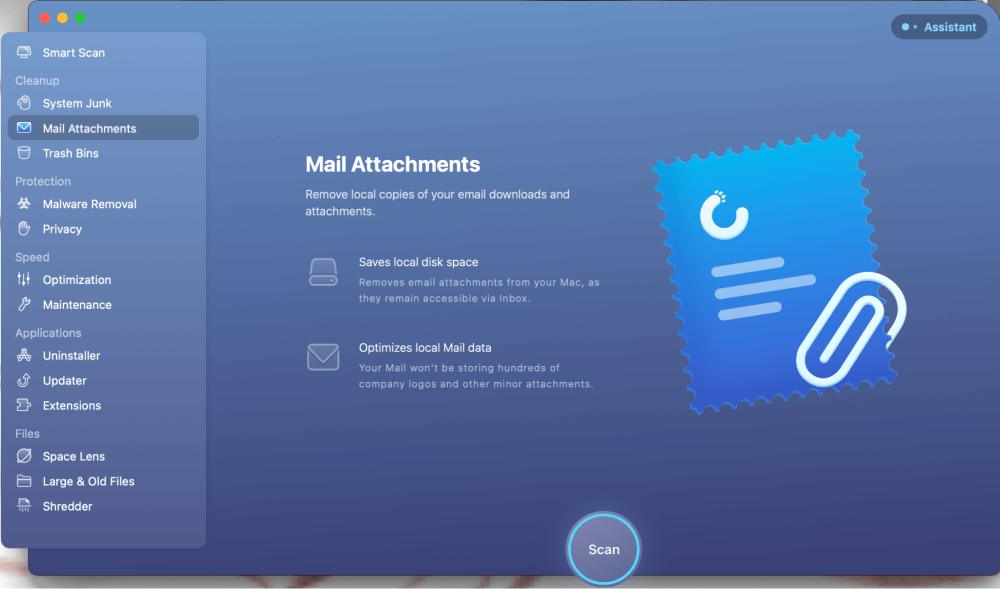 CleanMyMac X har også en funktion til at slette dine Mail-vedhæftede filer, hvis den proces, vi dækkede tidligere, er for tidskrævende for dig. Ligefind vedhæftede filer fra den venstre sidebjælke, og hit Scan. Appen tager sig af resten for dig uden besvær.