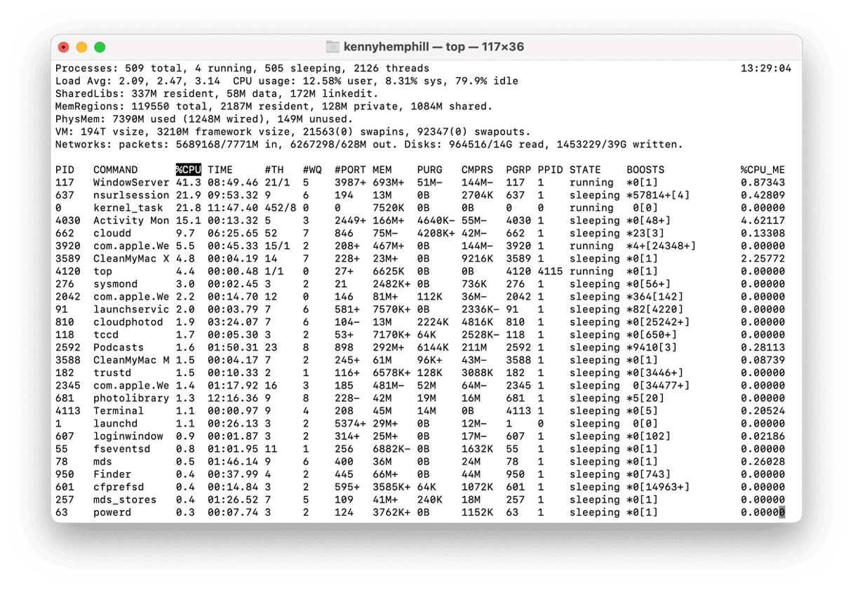 topog tryk på Retur. - Du vil se oplysninger i Terminal-vinduet, der fortæller dig, hvor mange processer der kører i øjeblikket, og hvilken procentdel af tilgængelige CPU-cyklusser de bruger. Nedenfor er en liste over processerne.