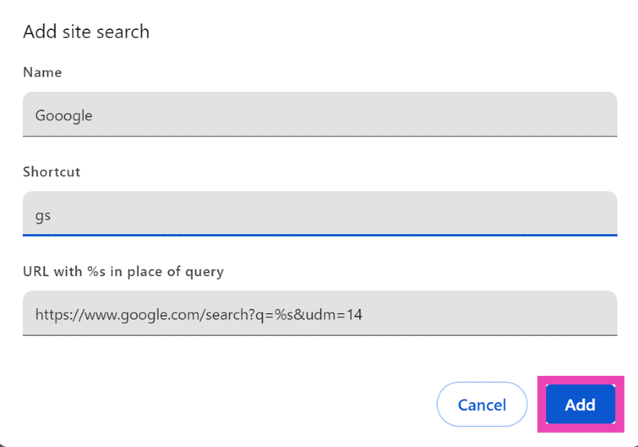 Trin 6:I 'URL med %s i stedet for forespørgslen’ indhttps://www.google.com/search?q=%s&udm=14. HitTilføje.