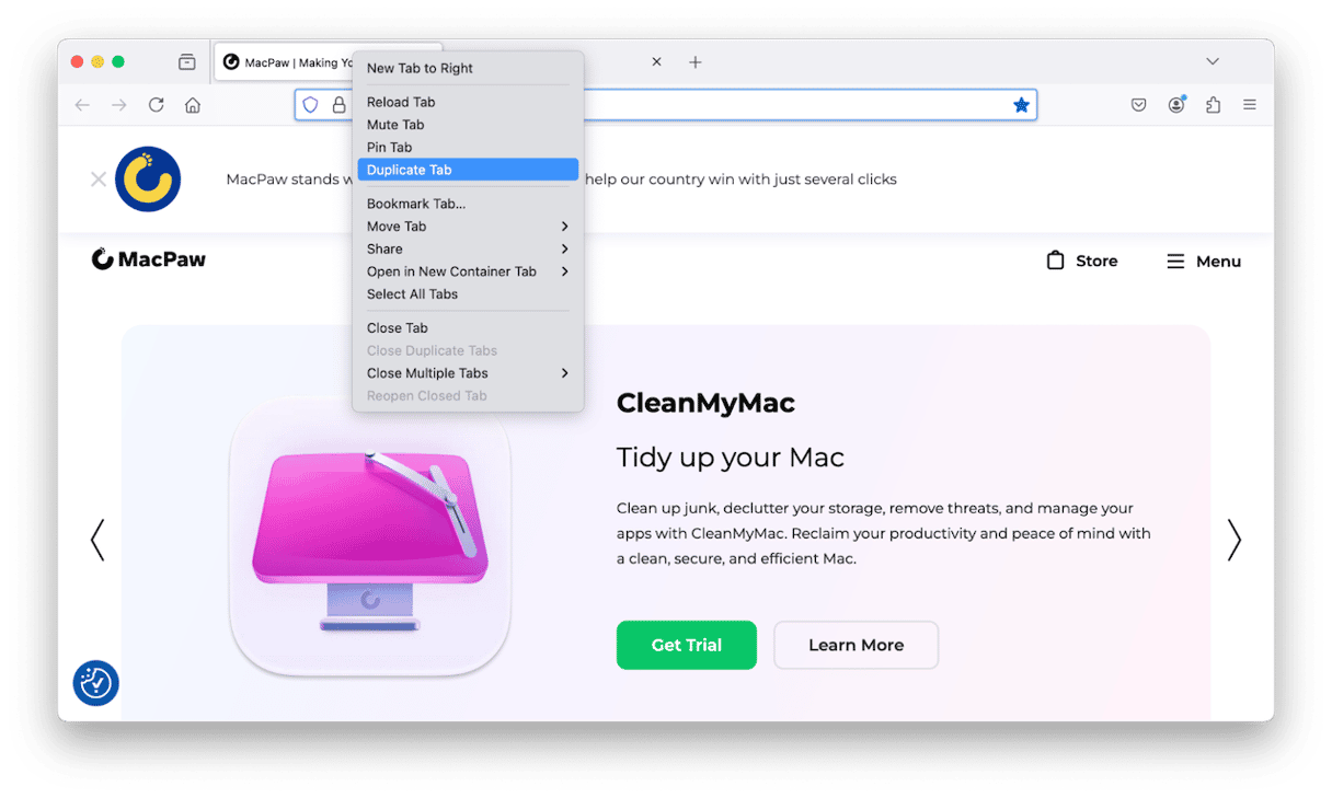 - Højreklik eller Ctrl-klik på fanen, og vælg Dupliker fane.