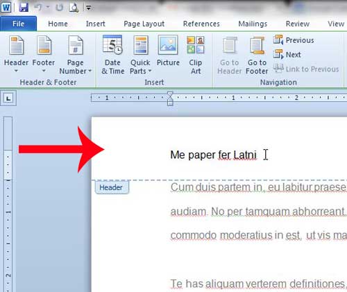 Nu hvor du ved, hvordan du redigerer en header i Word 2010, kan du bruge disse trin til at ændre oplysninger, der i øjeblikket vises på den pågældende placering i dit dokument.