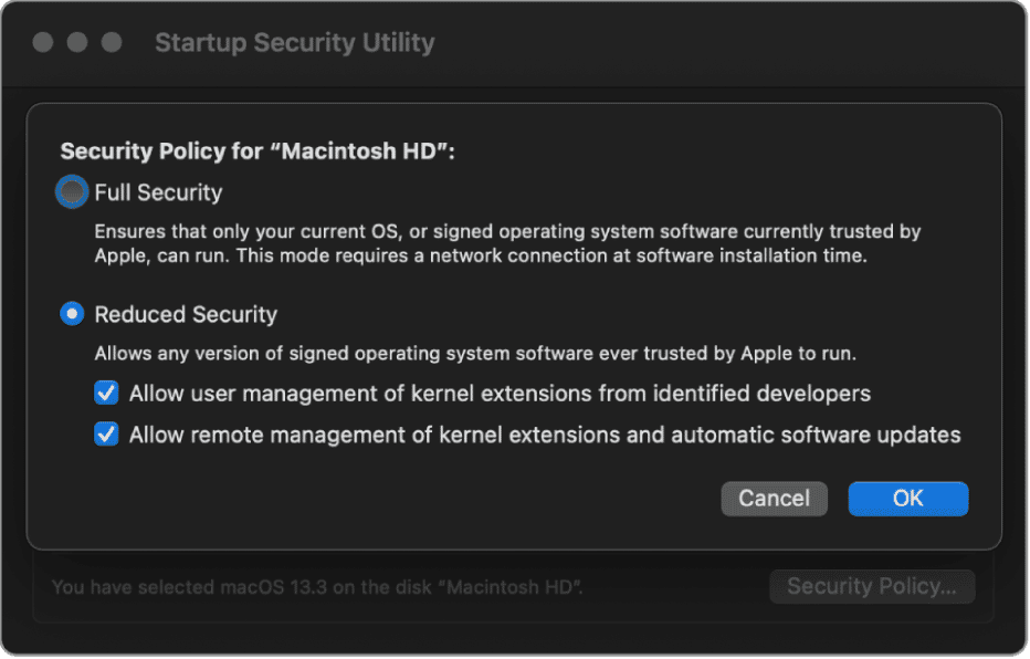 En af funktionerne ved Apples siliciumsystemer på en chip som M1, M2 og M3 er, at de har robust sikkerhed som standard. For eksempel har de en signeret systemvolumen, der forhindrer adgang til eller eksekvering af systemfiler, der ikke har en kryptografisk signatur fra Apple. Det betyder, at selvom du indstiller din Mac til at tillade, at apps installeres fra betroede udviklere, hvis kode er signeret, kan du muligvis ikke installere systemudvidelser, der kræves af et program. Det skyldes normalt, at apps bruger kerneudvidelser (kext-filer), som Apple omtaler som ældre systemudvidelser. I så fald skal du ændre din Macs sikkerhed