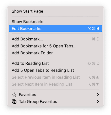 - Den tredje mulighed er at klikke på menuen Bogmærker og vælge Rediger bogmærker. Du vil se alle dine bogmærker i Safari-hovedvinduet. Du kan derefter klikke på rullemenuen ud for favoritter for at vise dem og højreklikke eller Ctrl-klikke på den, du vil fjerne, og vælge Slet.