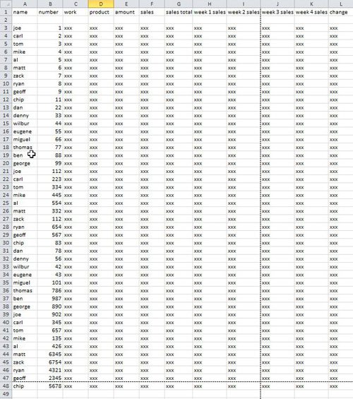 Bemærk, at jeg har været nødt til at zoome lidt ud vhaZoomværktøj påUdsigtfanen, så jeg kan vise alle data. Ved almindelig størrelse ville dette regneark faktisk udskrives på fire sider, hvilket er unødvendigt og skader præsentationen af dataene.