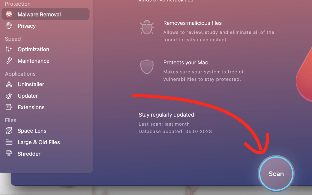 Når du har downloadet og installeret appen, skal du starte den og se efter Malware Removal fra mulighederne i venstre sidebjælke. Tryk derefter på Scan, og CleanMyMac X klarer resten.
