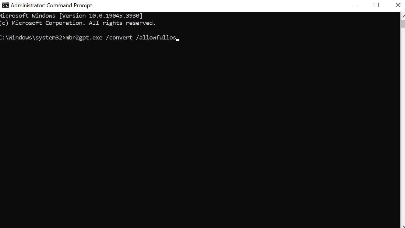 Trin 3For at konvertere MBR til GPT skal du åbne kommandoprompten ved at vælge muligheden forKør som administrator> type"mbr2gpt.exe /convert /allowfullos"og ramteIndtastnøgle.