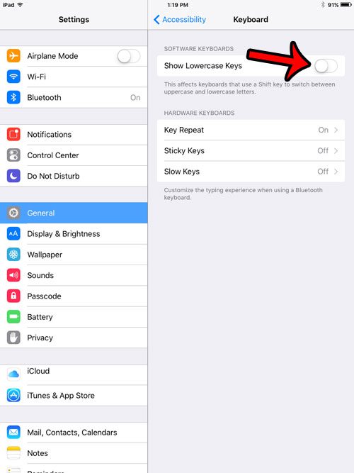 Så hvis du ikke kan lide, hvordan din iPad skifter bogstavetui baseret på, hvad den tror, du er ved at skrive, så kan du følge vores guide nedenfor for at slå indstillingen for små bogstaver fra. Resultatet bliver et tastatur, der altid viser de store versioner af bogstaver, som det gjorde i tidligere versioner af iOS. Disse trin blev udført på en iPad 2 i iOS 9.3.