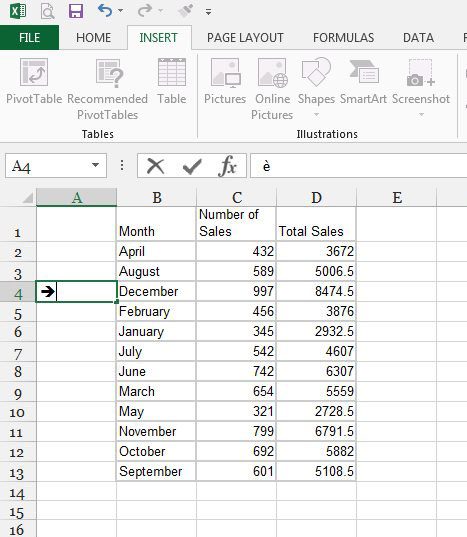 Afhængigt af den pil, du vælger, skal dit regneark se ud som på billedet nedenfor.