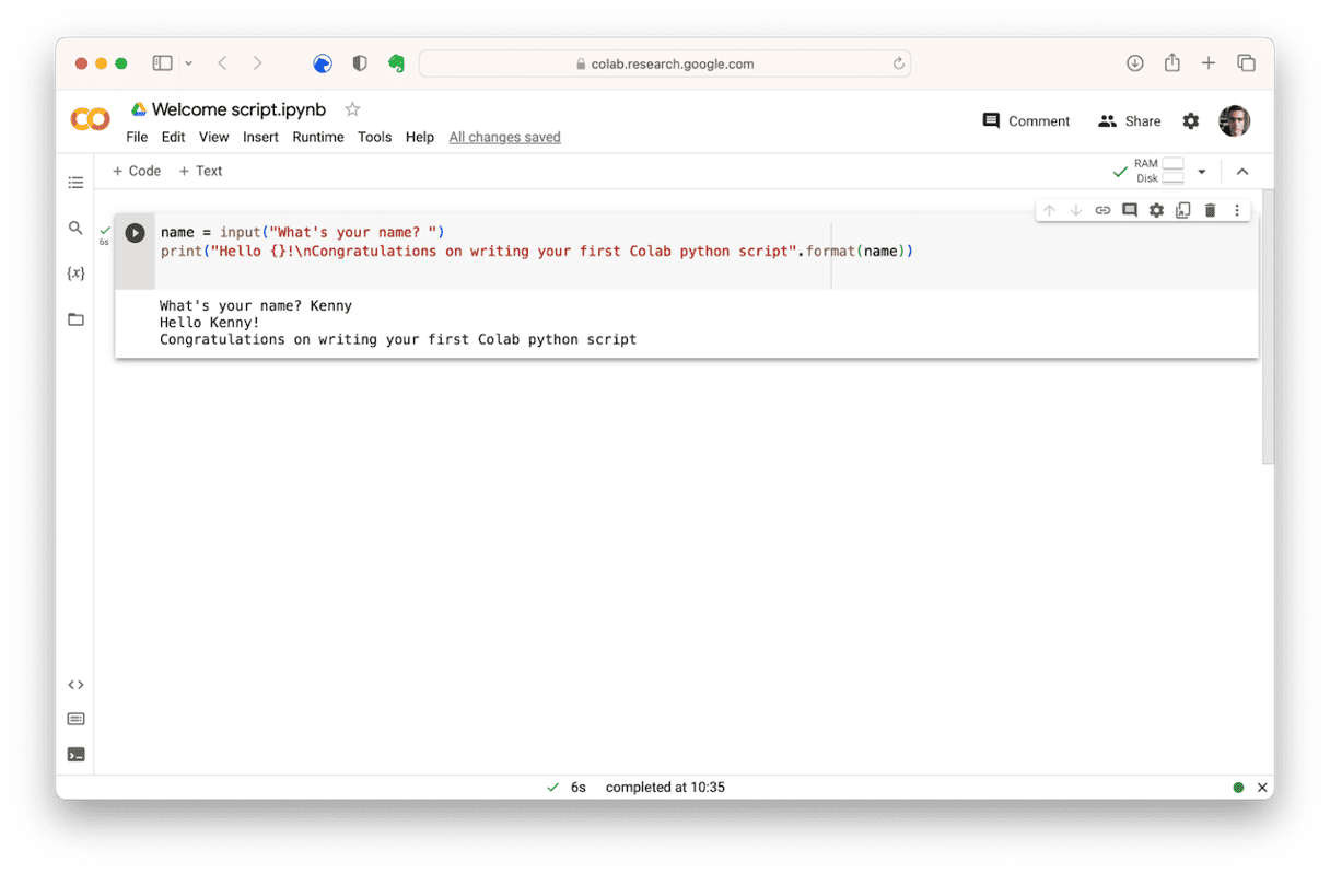 print(“Hej {}!\nTillykke med at have skrevet dit første Colab python-script”.format(name)) - Klik på afspilningsknappen i starten af scriptet.