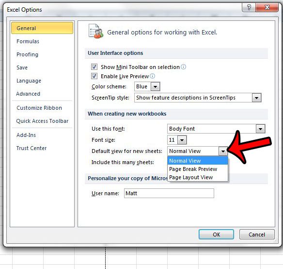 Vores artikel fortsætter nedenfor med yderligere oplysninger om ændring af standardvisningen i Excel 2010, herunder billeder af disse trin.