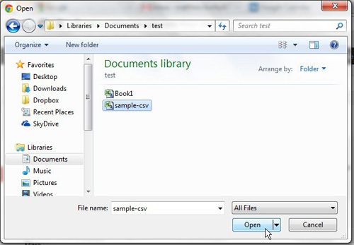 Trin 4: Gå til den CSV-fil, du vil åbne i Google Docs, klik på den én gang for at vælge den, og klik derefter påÅbenknappen nederst i vinduet.