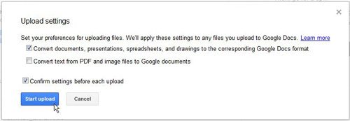 Trin 5: Klik på den blåStart uploadknappen nederst i vinduet. Bemærk, at du også skal markere feltet til venstre forKonverter dokumenter, præsentationer, regneark og tegninger til det tilsvarende Google Docs-format.