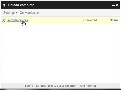 Trin 6: Klik på filnavnet iUpload fuldførtafsnittet i højre side af vinduet for at åbne din uploadede CSV-fil i Google Docs.