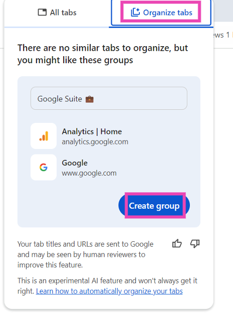 Selvfølgelig kommer hver AI-funktion med bekymringer om dataforbrug. Til denne funktion indsamler Google sidetitler, webadresser, fanegruppedata og din feedback. Disse data, som inkluderer generativ modelforskning og maskinlæringsteknologier, bruges til at forbedre denne funktion.