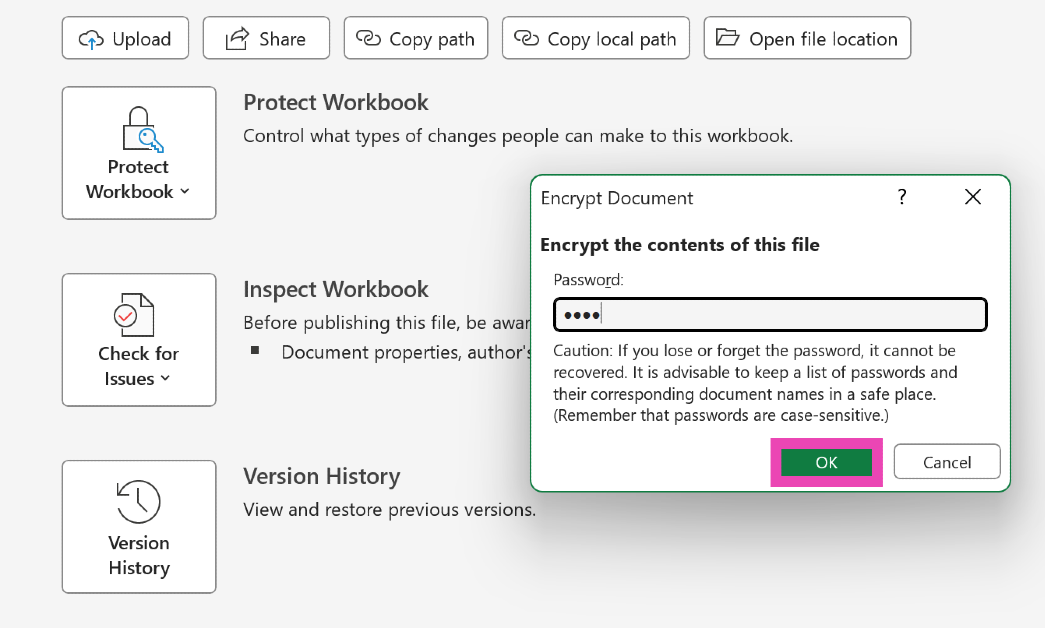Åbn regnearket og gå tilFil > Info. Klik på 'Beskyt projektmappe' og vælg 'Krypter med adgangskode' fra listen over muligheder.