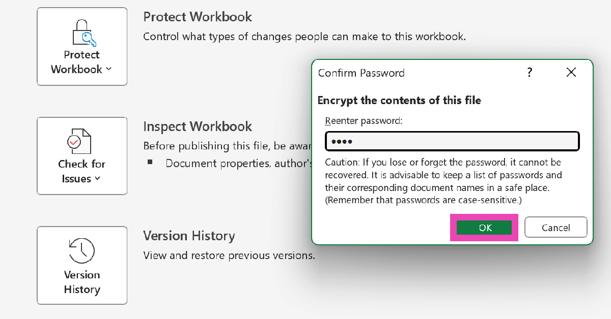 Krypter med adgangskode:Brugere kan kun se regnearket og foretage ændringer i det, hvis de har adgangskoden.