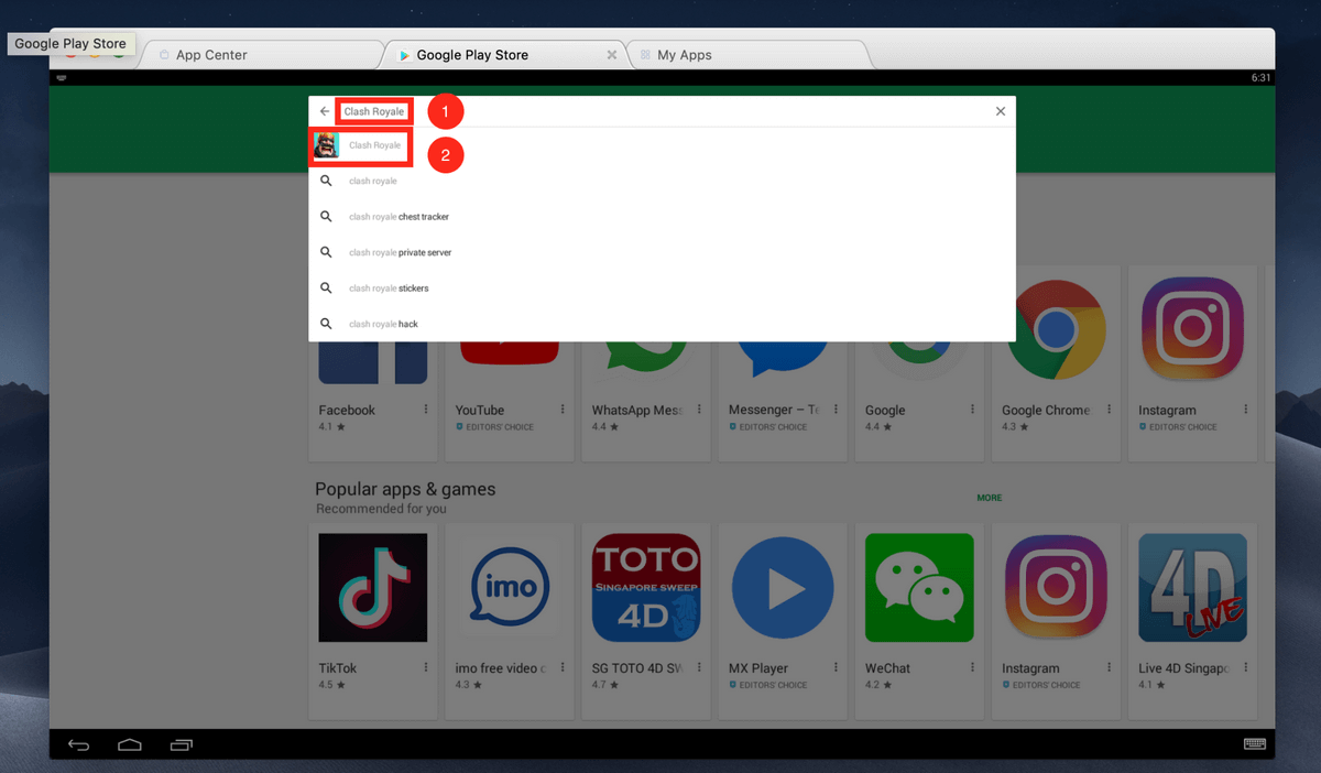 Når du er logget ind, skal du søge efter Clash Royale i Play Butik. Skriv 'Clash Royale' i søgefeltet. Clash Royale skulle vise sig i toppen som det første resultat. Klik på den.