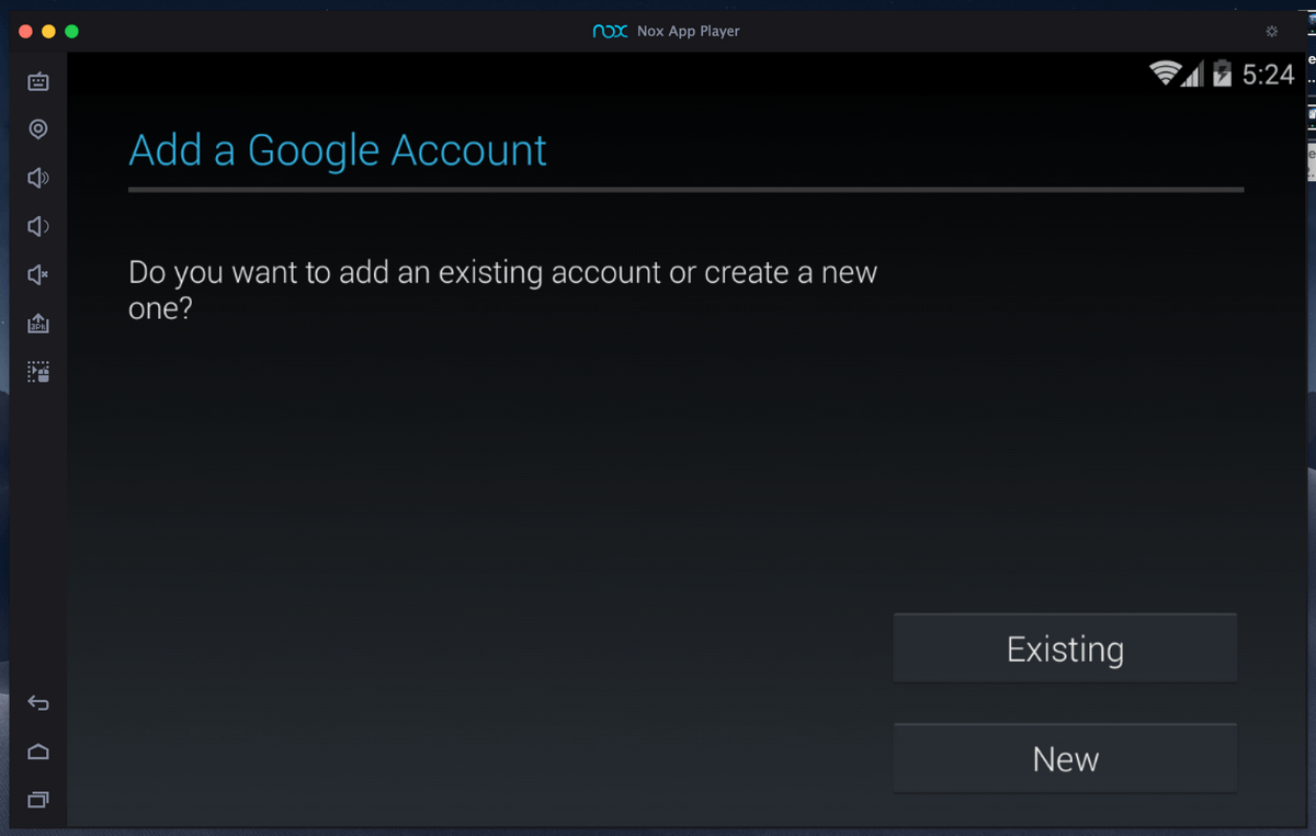 Du bliver derefter spurgt, om du ejer en Google-konto. Hvis du ikke har en eksisterende Google-konto, bør du gå hen og oprette en, før vi går videre. For at gøre det, klikNy. Hvis du allerede har en Google-konto som jeg har, skal du klikkeEksisterende.
