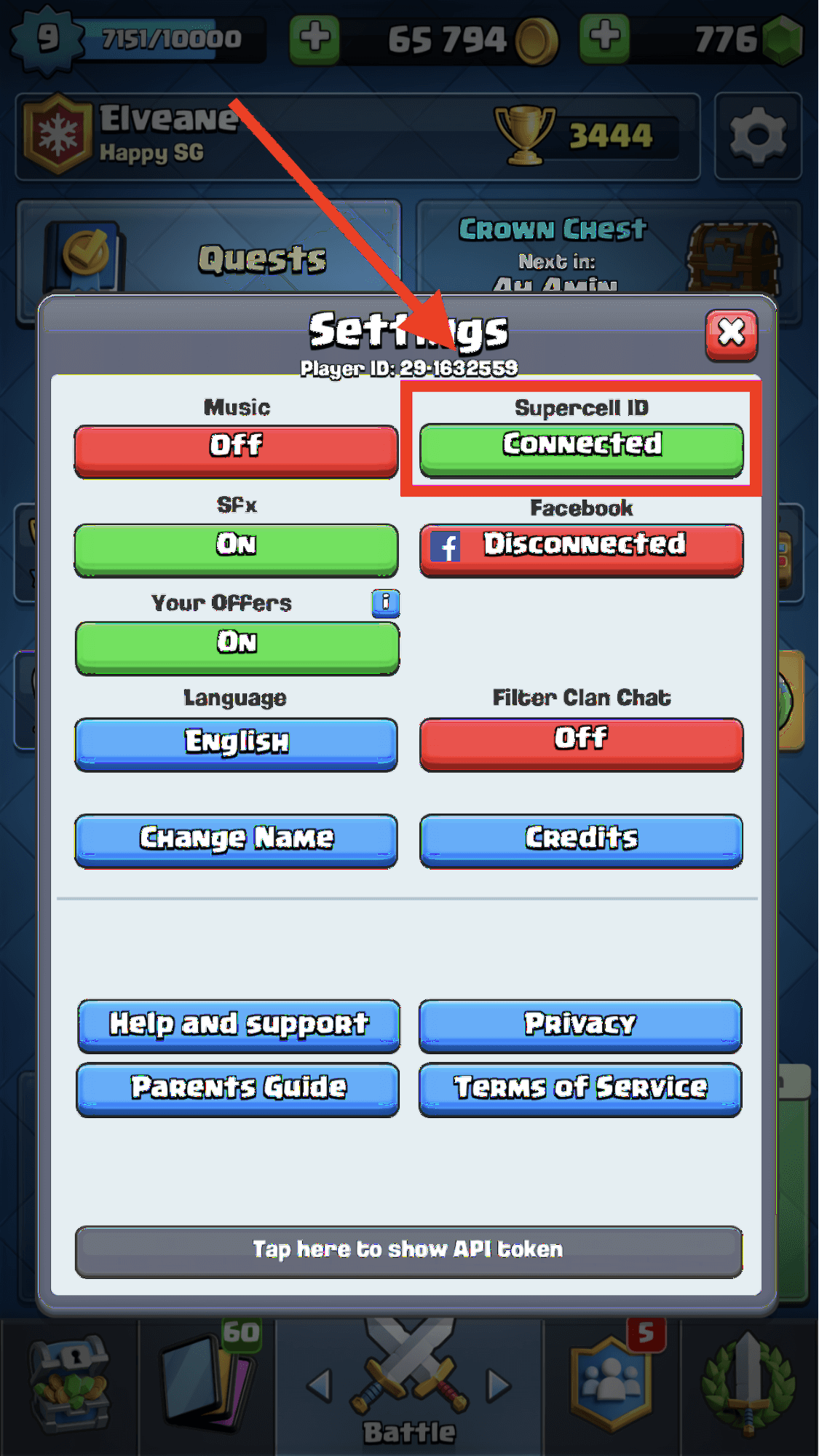 Hvis du ikke allerede har et, så tilmeld dig et Supercell ID på din mobil ved at klikke påIndstillingerikon i øverste højre hjørne (Supercell er Clash Royales moderselskab).