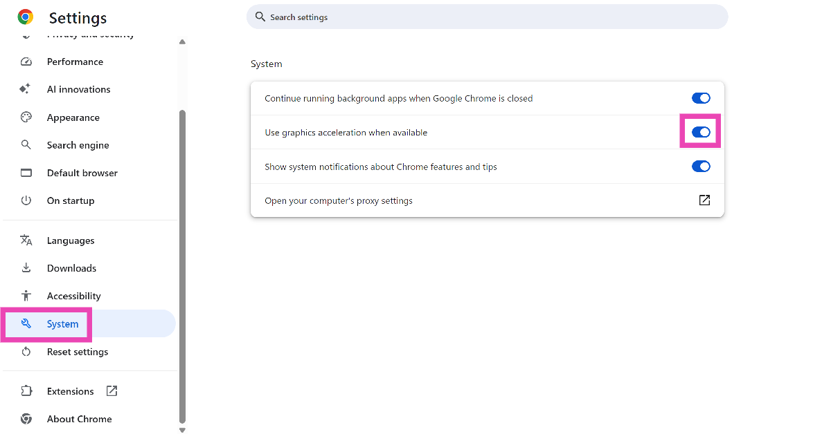 Gå tilIndstillinger > System, og tænd for vippekontakten ud for 'Brug grafikacceleration, når tilgængelig'.