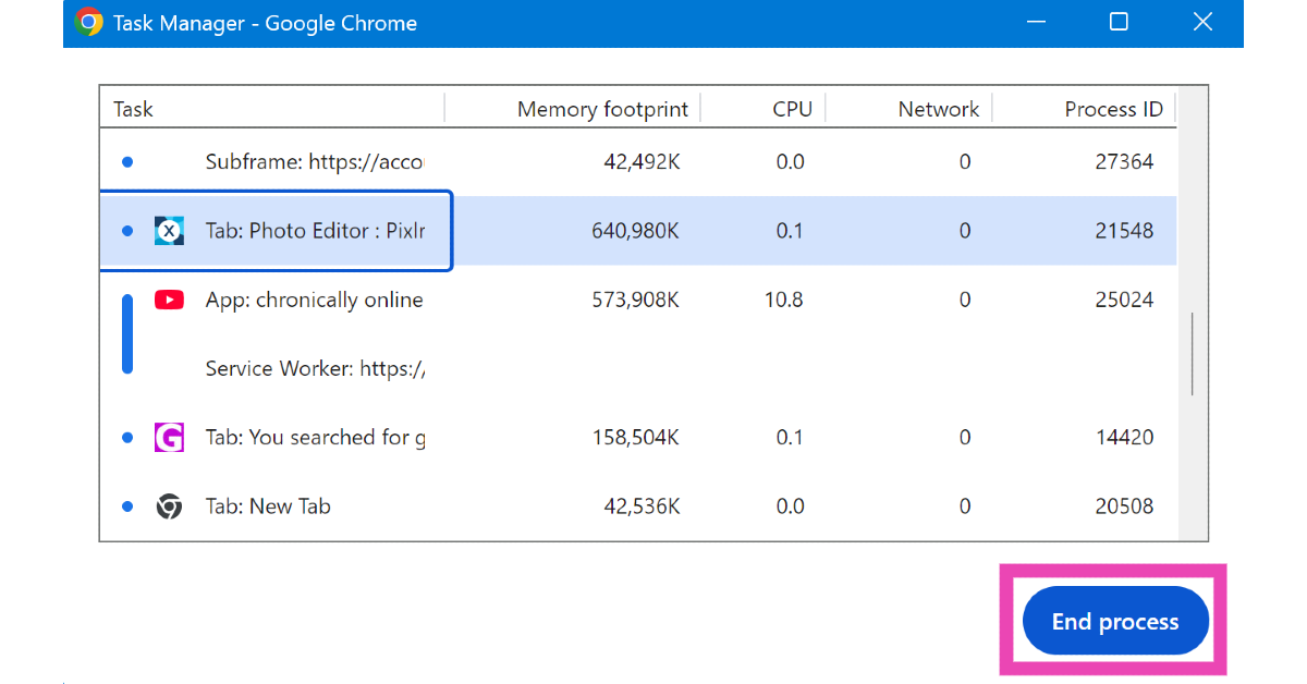 Du kan øge hastigheden på Google Chrome på din pc ved at rydde dens RAM. Tryk på 'Shift + Esc' i Chrome for at åbne dens opgavehåndtering, vælg den opgave, der optager mest hukommelse, og afslut processen.