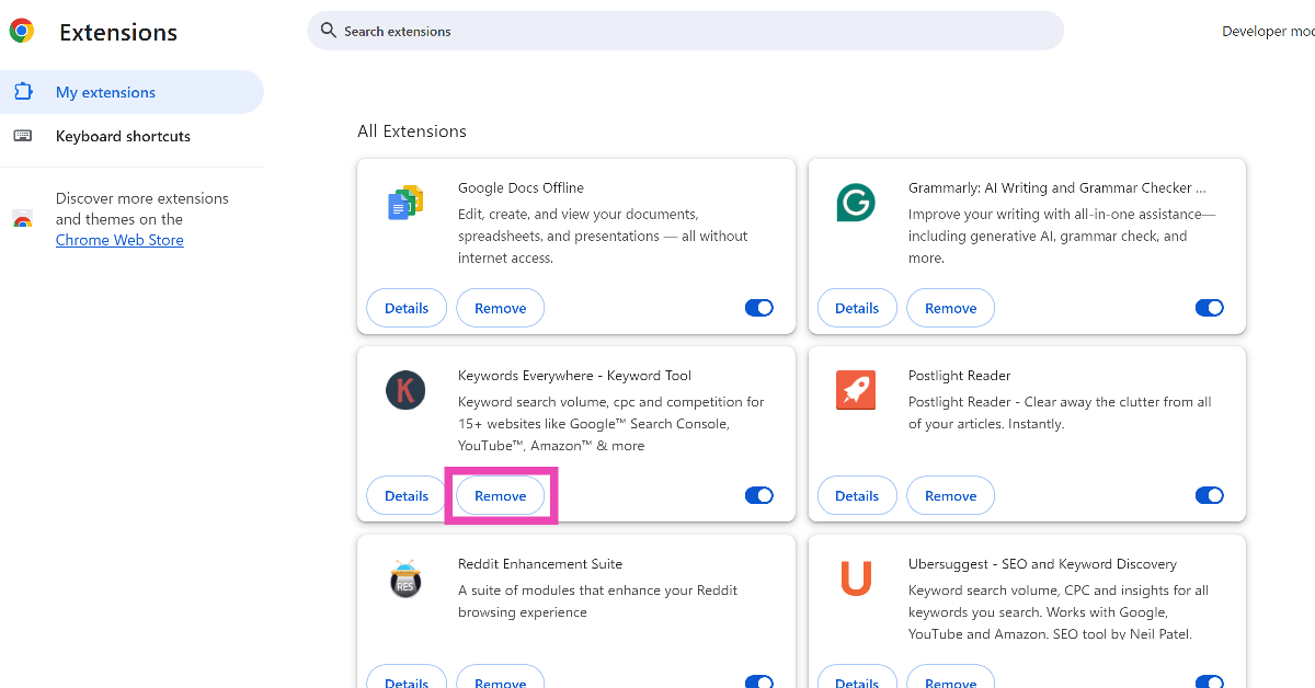 At beholde udvidelser, som du ikke længere bruger, kan gøre Google Chrome langsommere. Korrupte udvidelser kan forstyrre rutineopgaver og forårsage funktionsfejl. Klik på puslespilsbrikkeikonet ved siden af adressefanen for at se dine installerede udvidelser. Tryk på ellipserne ved siden af dem, du vil afinstallere, og vælg 'Fjern fra Chrome'. Alternativt kan du trykke på ellipserne, gå tilUdvidelser>Administrer Udvidelser, og tryk på 'Fjern' på de udvidelser, du ønsker at afinstallere.