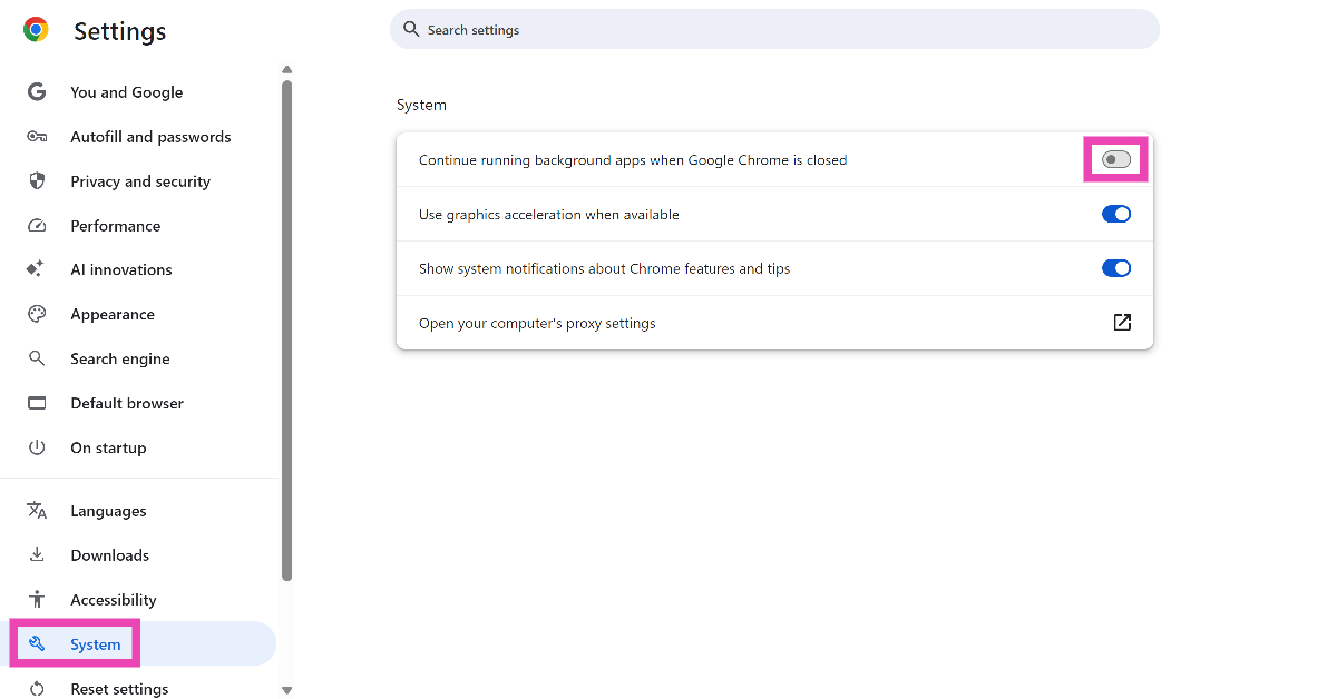 Trin 4:Sluk for vippekontakten ved siden afFortsæt med at køre baggrundsapps, når Chrome er lukket.