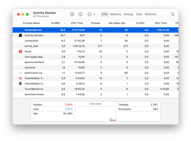 - Hvis WindowServer er tæt på toppen og fylder mere end 60 % af CPU-ressourcerne, ved du, at den bruger flere CPU-cyklusser, end den burde.