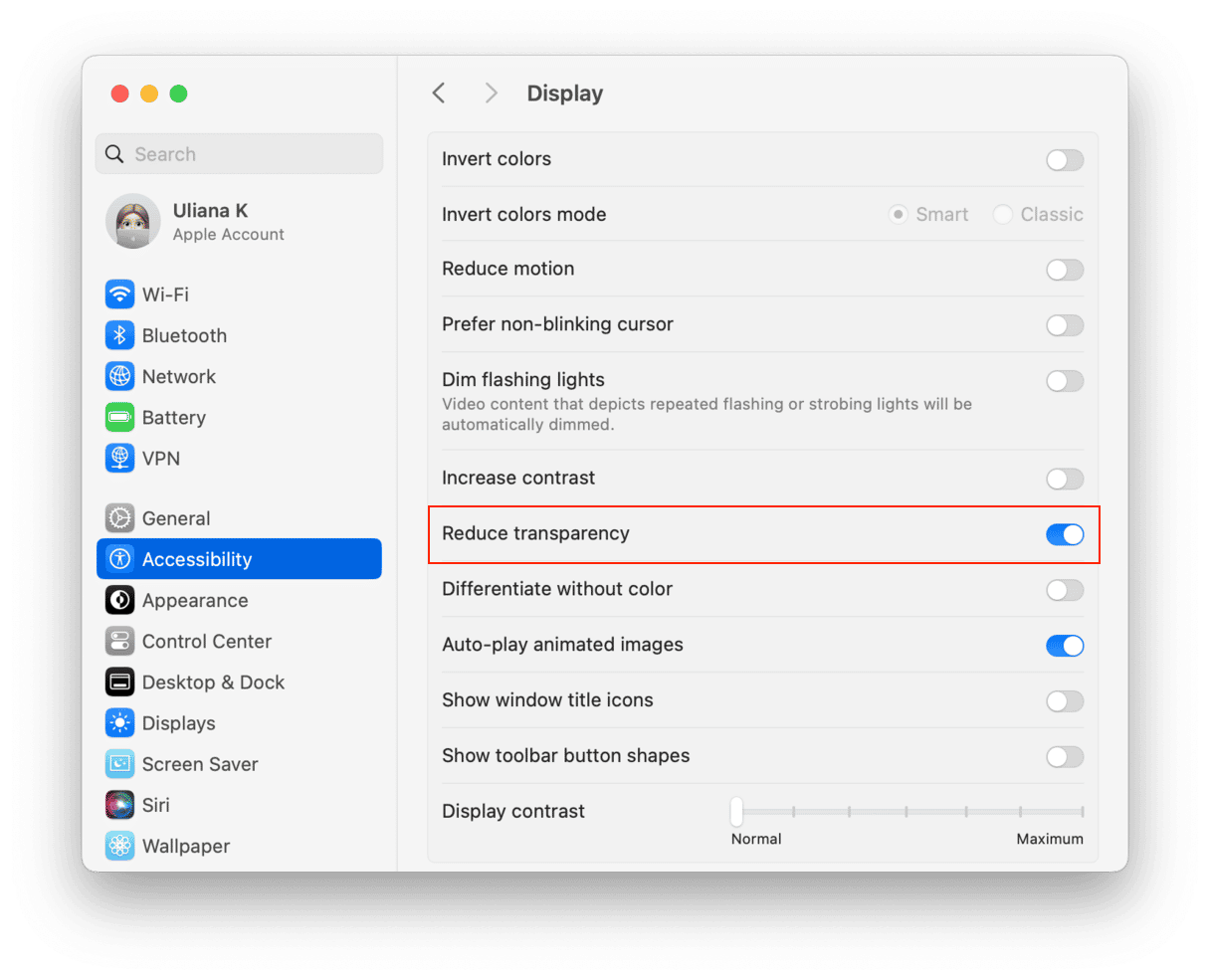 Funktioner som gennemsigtighed i Windows bruger også flere CPU-cyklusser. Du kan ikke deaktivere alle visuelle effekter, men du kan slå gennemsigtighed fra ved hjælp af Tilgængelighedsruden i Systemindstillinger. Sådan slår du det fra: