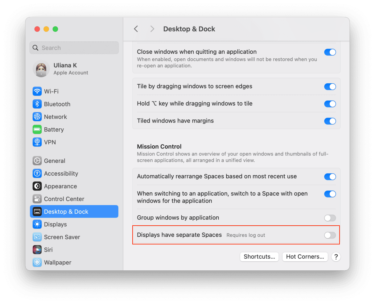 - Under Mission Control skal du deaktivere "Skærm har separate rum."