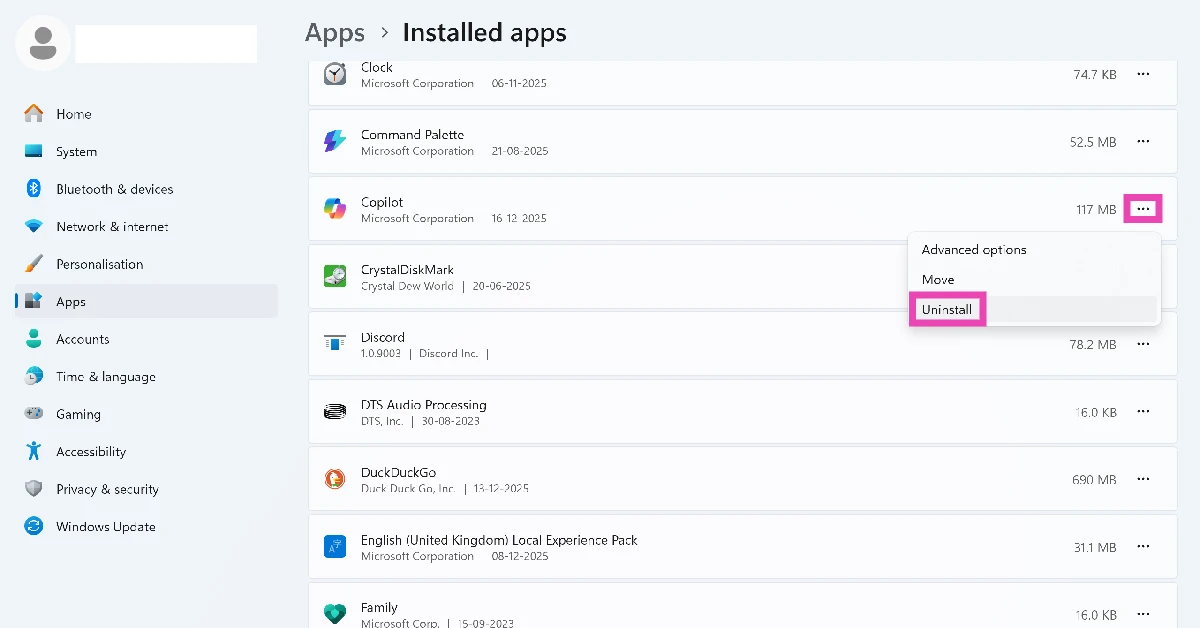 Gå tilIndstillinger>Apps>Installerede apps, klik på ellipserne ved siden af Copilot og vælg 'Afinstaller'.