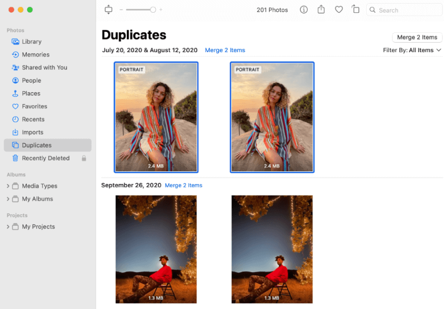 Dine dubletter vilflettes til én fil. Hvis en af dubletterne er af lavere kvalitet eller opløsning, vil Mac automatisk bevare kopien i højere opløsning i stedet.