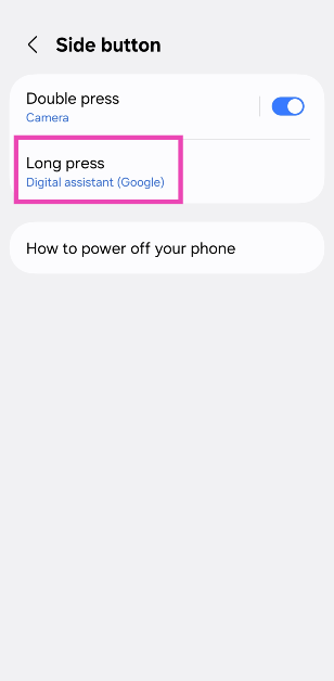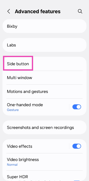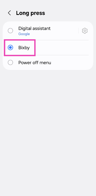 Gå tilIndstillinger>Avancerede funktioner>Sideknap>Langtrykog vælg Bixby.