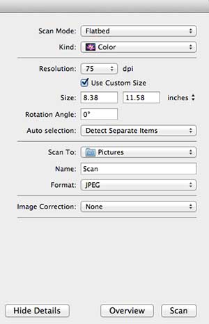 Indstil dine indstillinger, og klik derefter på knappen ScanHvis du har brug for at ændre noget ved filformatet, kan du klikke påVis detaljerknappen til venstre forScanknap. Denne menu giver dig mulighed for at vælge dit foretrukne filformat og opløsning.