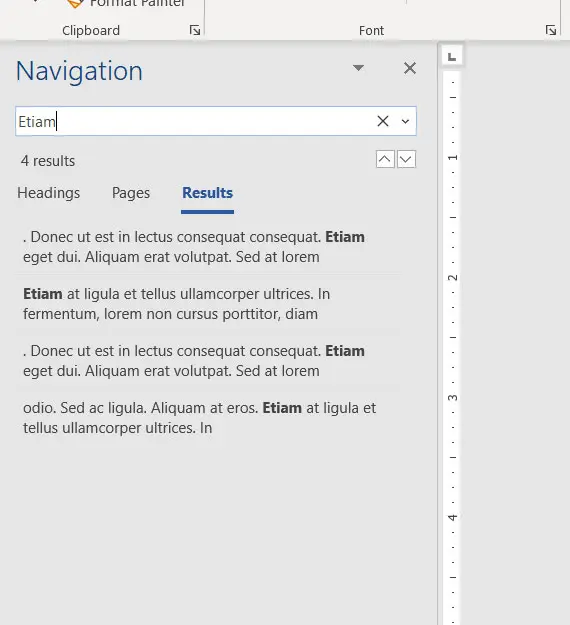 Resultater, der indeholder dit søgeord, vises i kolonnen. Du kan derefter klikke på et søgeresultat for at blive ført til dets placering i dokumentet.
