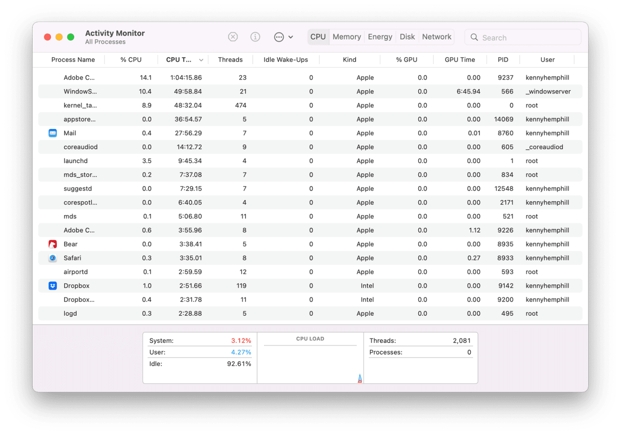 Du kan også bruge Activity Monitor til at få et overblik over det samlede antal CPU-cyklusser i brug, RAM, der er optaget, eller netværksaktivitet på et givet tidspunkt. Og hvis du har brug for at afslutte en proces, der har hængt eller bruger for mange CPU-cyklusser, kan du bruge knappen Afslut proces (x) på værktøjslinjen.