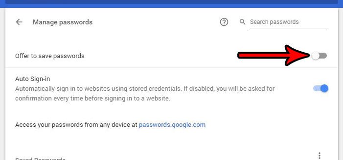 Men du vil måske ikke have, at dine adgangskoder gemmes i din webbrowser, hvis andre bruger din computer, hvis du forsøger at lave din egen google.com, eller hvis din computer vil være ude af din besiddelse. Derfor er det nyttigt at slå funktionen fra i Google Chrome, der tilbyder at huske dine adgangskoder. Vores vejledning nedenfor viser dig, hvor du kan finde denne indstilling, så du kan deaktivere den.