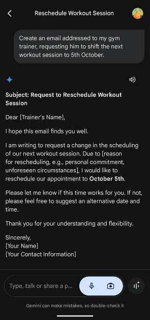 Trin 2:Indtast enhurtigfor en e-mail. For eksempel kan du bede Gemini om at oprette en e-mail, der anmoder om at omplanlægge et møde.