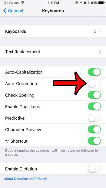 Hvis du følger disse trin, stoppes adfærden på din iPhone, hvor et forkert stavet eller ukendt ord erstattes af et, som iPhone tror, du prøvede at skrive. Dette er blot en af mange måder, hvorpå du kan tilpasse opførselen af din iPhones tastatur; for eksempel kan du skjule den grå bjælke med forslag over dit tastatur.
