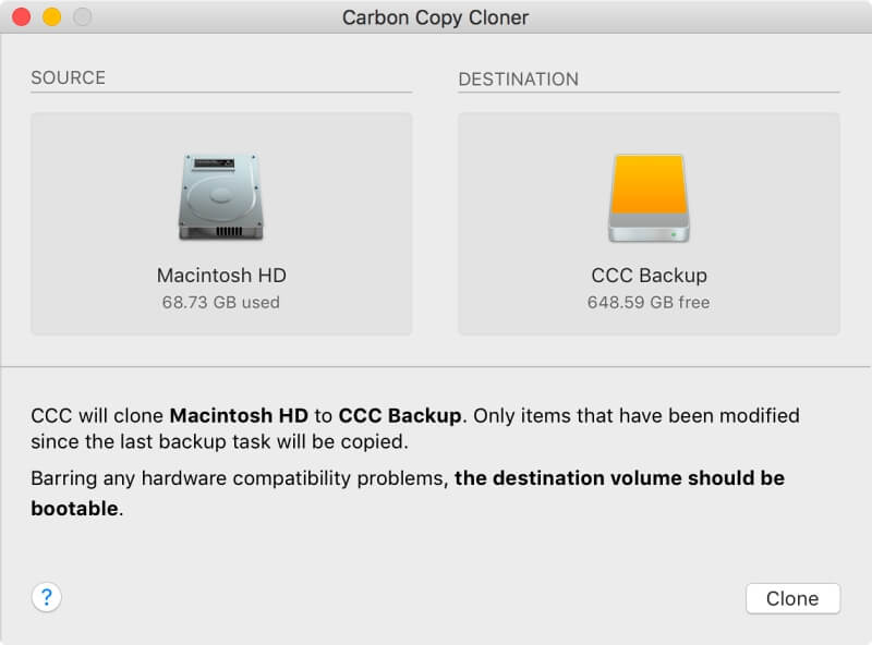 Carbon Copy Clonerer en solid mulighed for kloning eller billeddannelse af harddiske. Det er en anden sikkerhedskopieringsstrategi end Time Machine: i stedet for at sikkerhedskopiere individuelle filer, laver den en nøjagtig kopi af hele drevet.