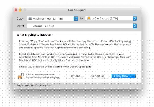 SkjortelommeSuperDuper! v3er et enklere og mere overkommeligt program til diskkloning. Mange af dens funktioner er gratis; den fulde app koster $27,95 og inkluderer planlægning, smart opdatering, sandkasser og scripting. Ligesom Carbon Copy er det klondrev, det opretter, bootbart.