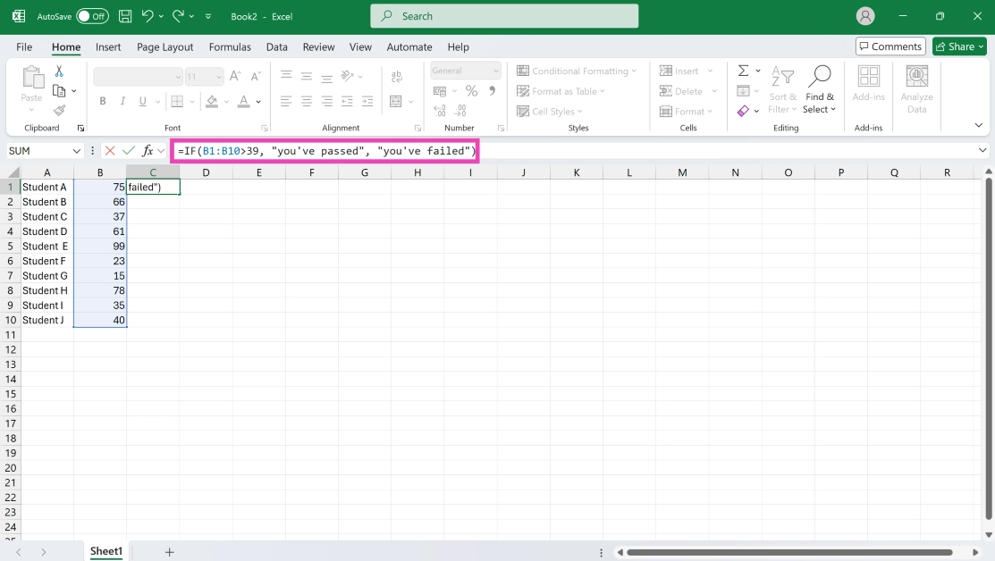 =HVIS(B1:B10>39, "Du har bestået testen", "Du har ikke bestået testen")