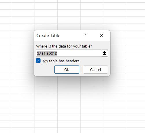 Du vil også være i stand til at markere eller fjerne markeringen i feltet ved siden afMin tabel har overskrifter.