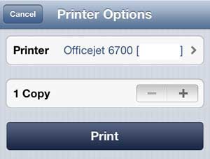 Vælg indstillingen UdskrivTrin 6: HvisPrinterfeltet ikke allerede er udfyldt med navnet på din AirPrint-printer, tryk påPrinterknappen, og vælg derefter printeren på listen.