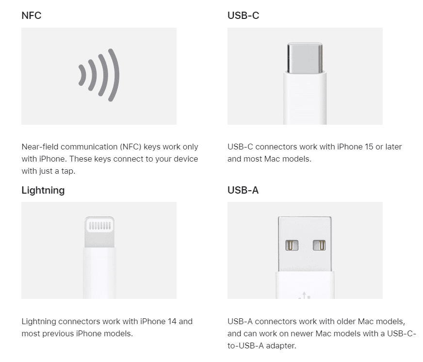 Apple-enheder understøtter forskellige typer sikkerhedsnøgler.USB-C nøglerer kompatible med nyere Macs og iPads. De forbinder direkte til enhedens port.NFC nøglerarbejde med iPhones og kan trykkes for at godkende.