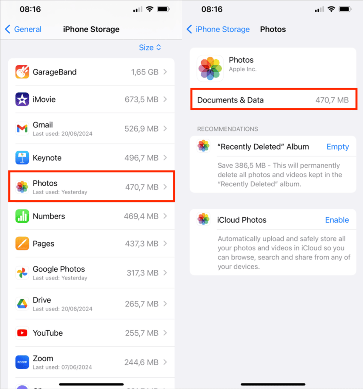 - Tryk på en app for at se, hvor meget plads dens dokumenter og data bruger.
