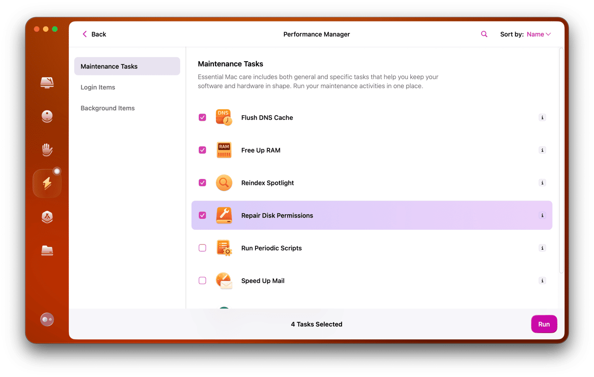 Du kan ofte rette og forhindre disse problemer ved regelmæssigt at køre vedligeholdelsesmodulet i CleanMyMac. Det har et specifikt værktøj, der reparerer disktilladelser og gendanner ødelagte filer og mapper med få klik.