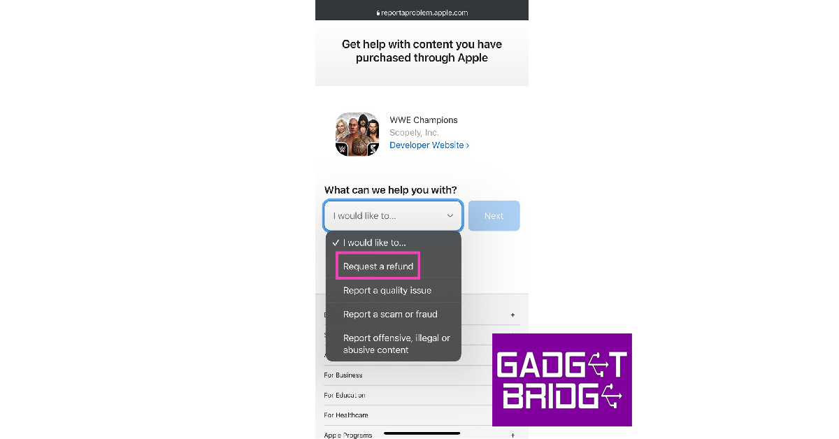 Gå til for at refundere en appApp Store>Konto>Mine køb>App>Rapportér et problemog vælg Refund på Apples side Rapporter et problem.